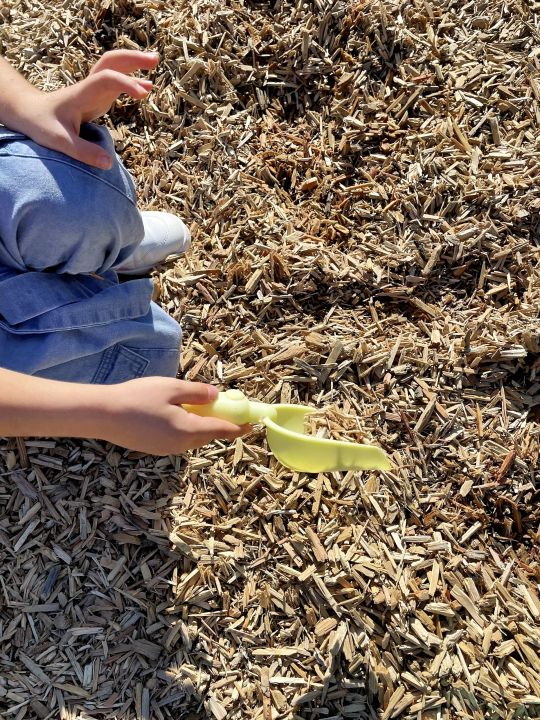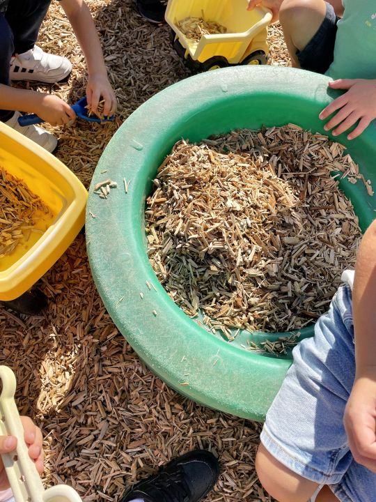 Les élèves du bâtiment A ont eu la joie de découvrir de nouveaux jeux dans la cour ; ils peuvent ainsi pleinement investir la zone de copeaux installée depuis cet été.